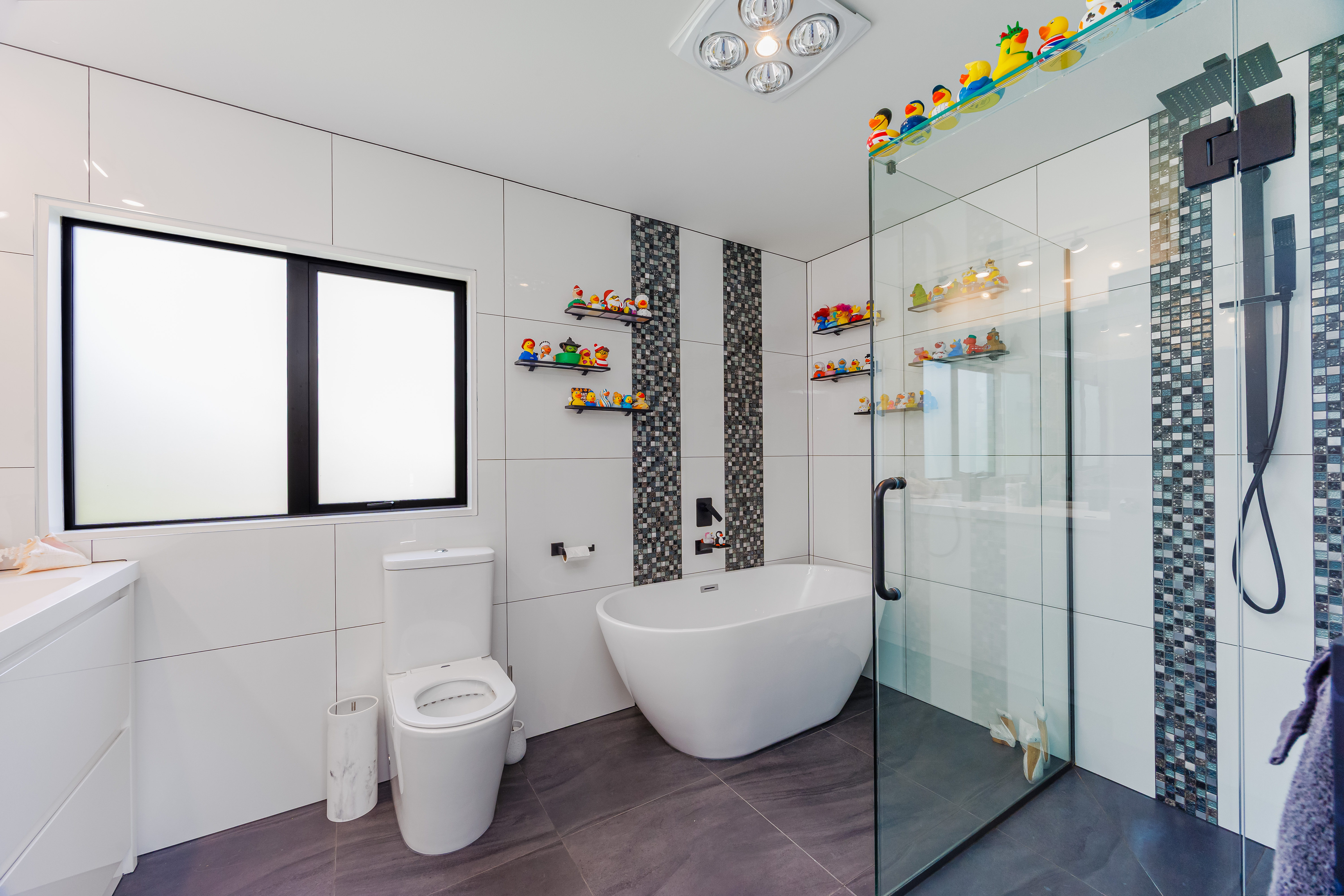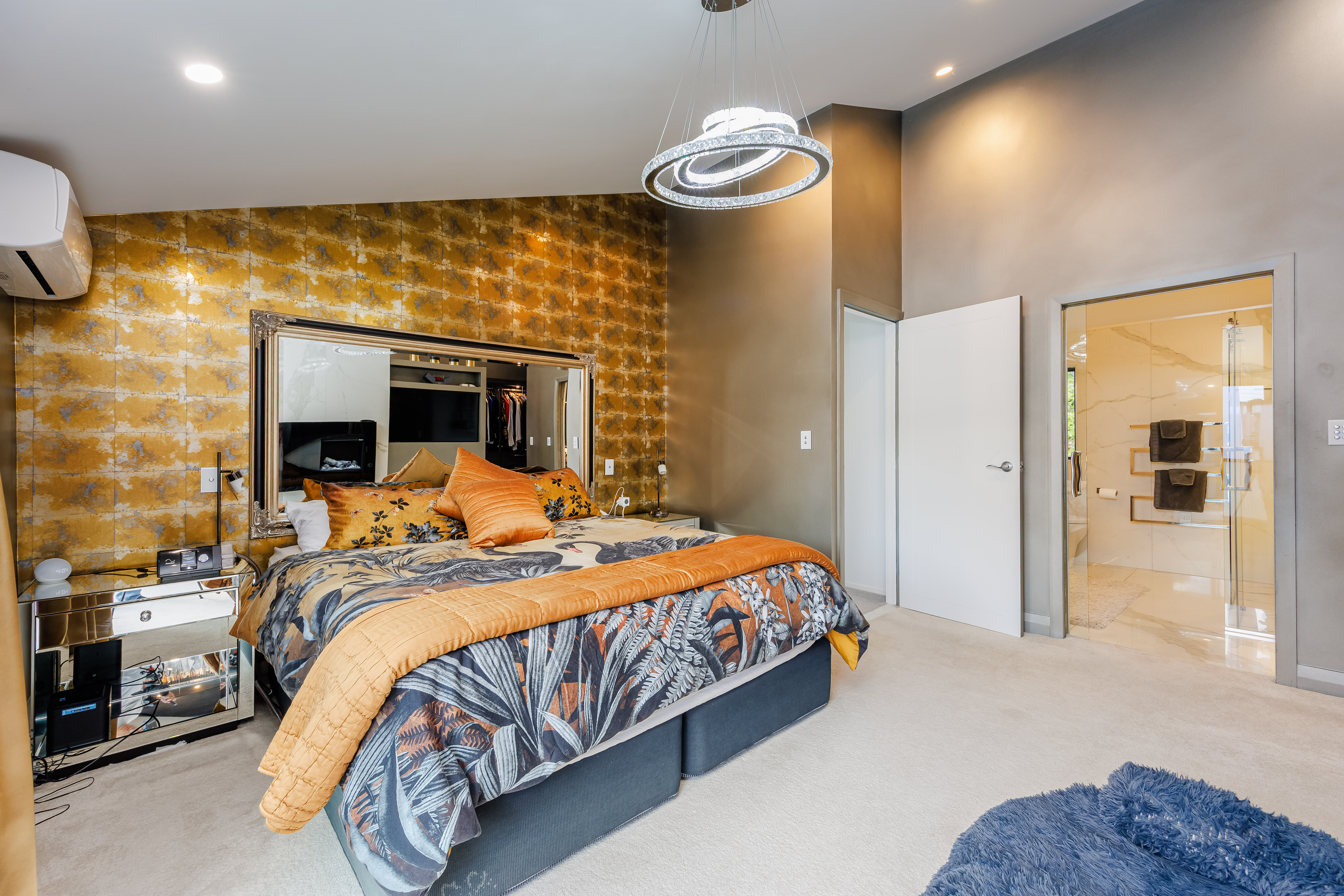 Upstairs, the master suite is a true retreat. English imported wallpaper adds warmth and texture, while the Lazy Lee walk-in wardrobe, complete with rotating shoe tower and dressing vanity, feels like something from a boutique hotel. The ensuite combines practicality and indulgence, with double basins, a rain shower and a sense of quiet luxury that makes mornings feel easy.