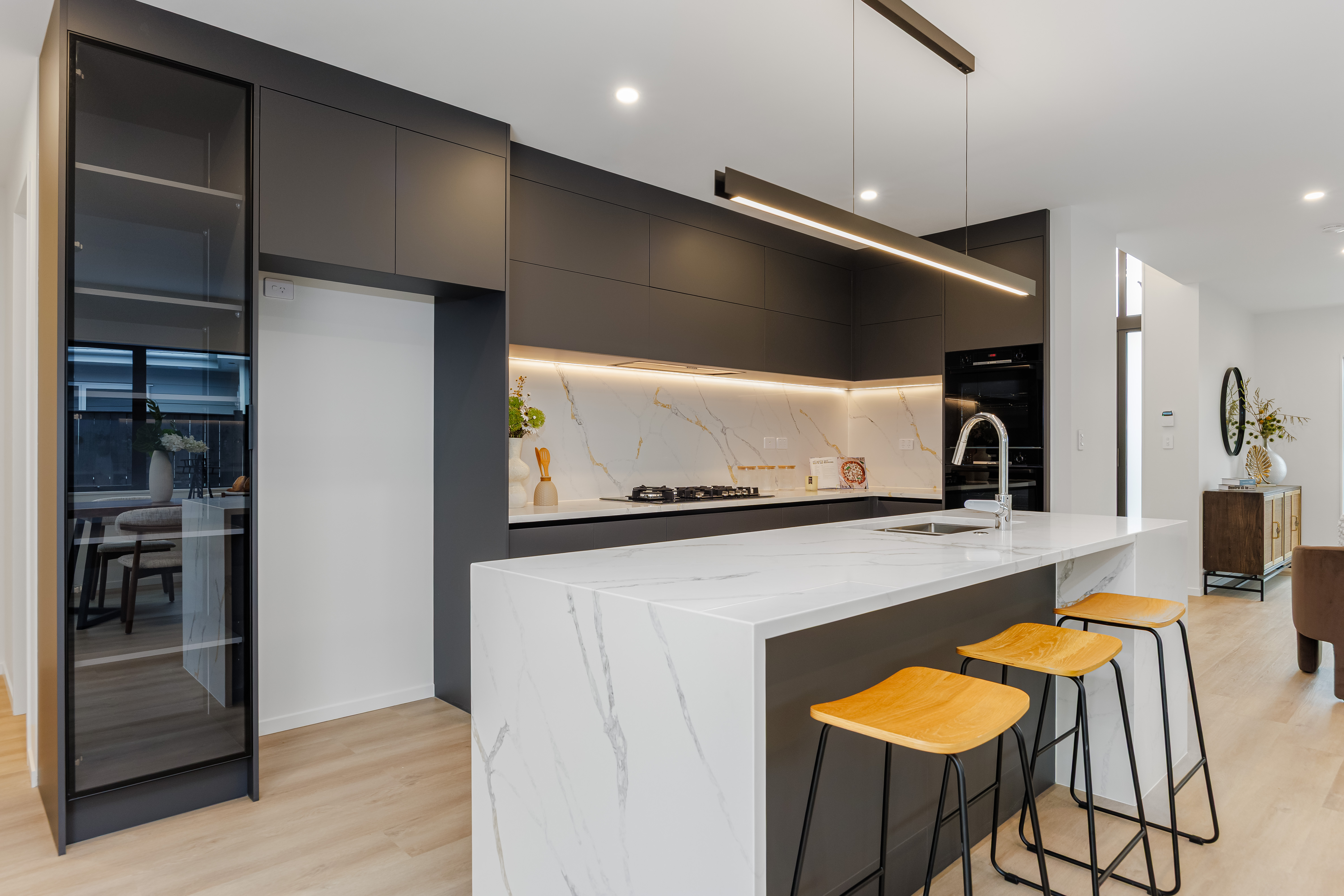 The eye-catching dark-hued kitchen strikes the ideal balance between sophistication and functionality, equipped with a sizable island counter, top-tier appliances and a capacious walk-in pantry - perfectly suited for daily meal prep and entertaining loved ones. A standalone powder room and dedicated laundry space further boost practicality for hectic family schedules.