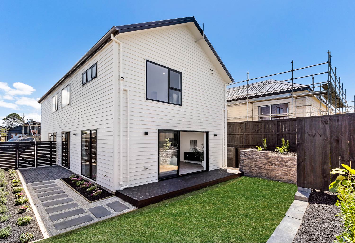 The sunny deck is ideal for weekend barbecues, kids' playtime or tranquil evening relaxation, complemented by integrated LED strip lighting that enhances the modern interior aesthetic, as well as an insulated garage door for added efficiency and comfort.